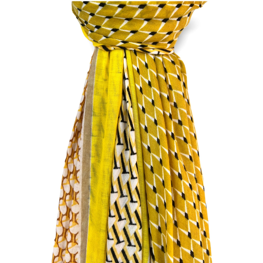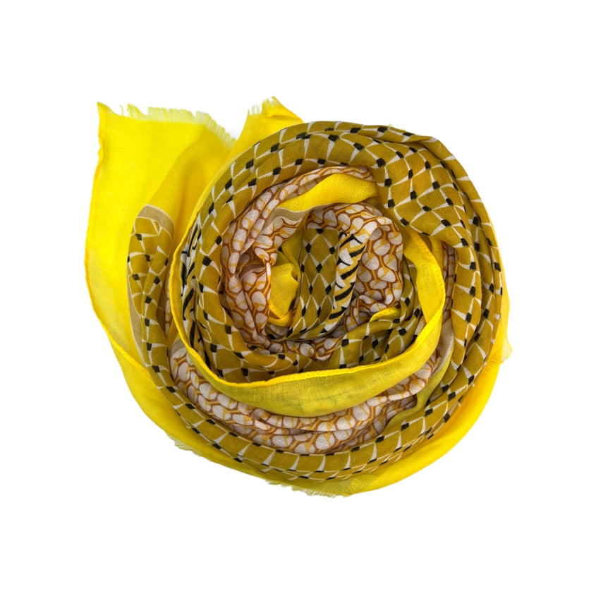 Lightweight with bright colour scarf with fringes. The style of scarf has three geometrical patterns painted and is finished with a frayed edge. Perfect to style with plain knitwear and outerwear to bring modern patterning to an outfit.