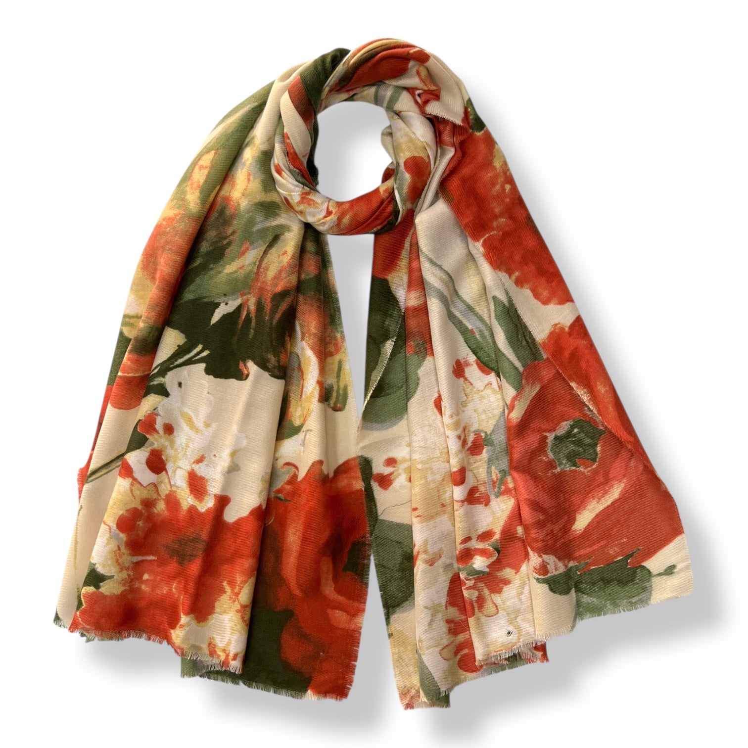 This elegant scarf features a soft watercolour floral design in beautiful autumnal shades of rust, cream, and olive green. The painterly brushstrokes give it an artistic and romantic feel, making it a standout accessory for the season.