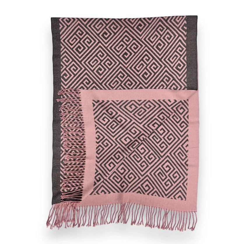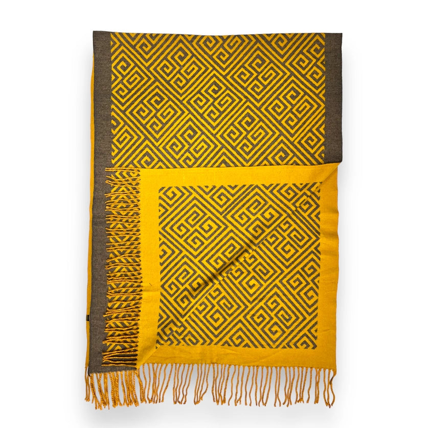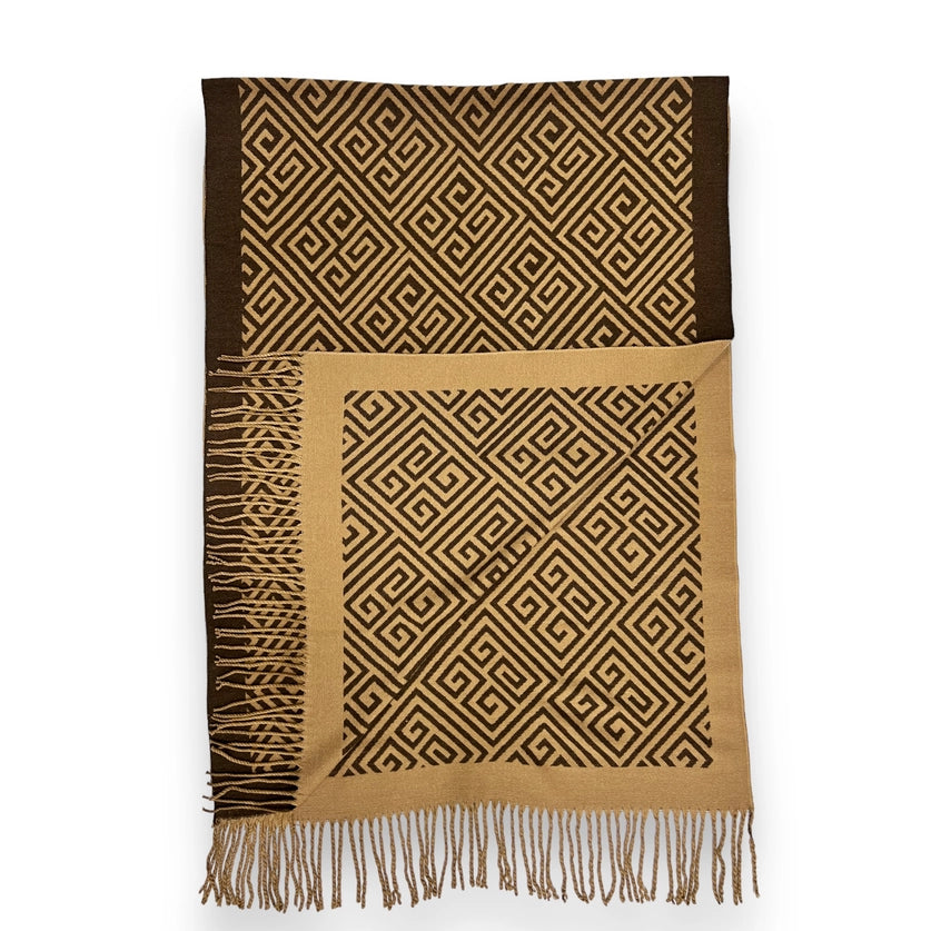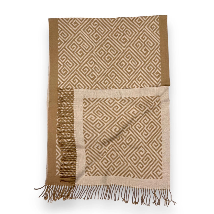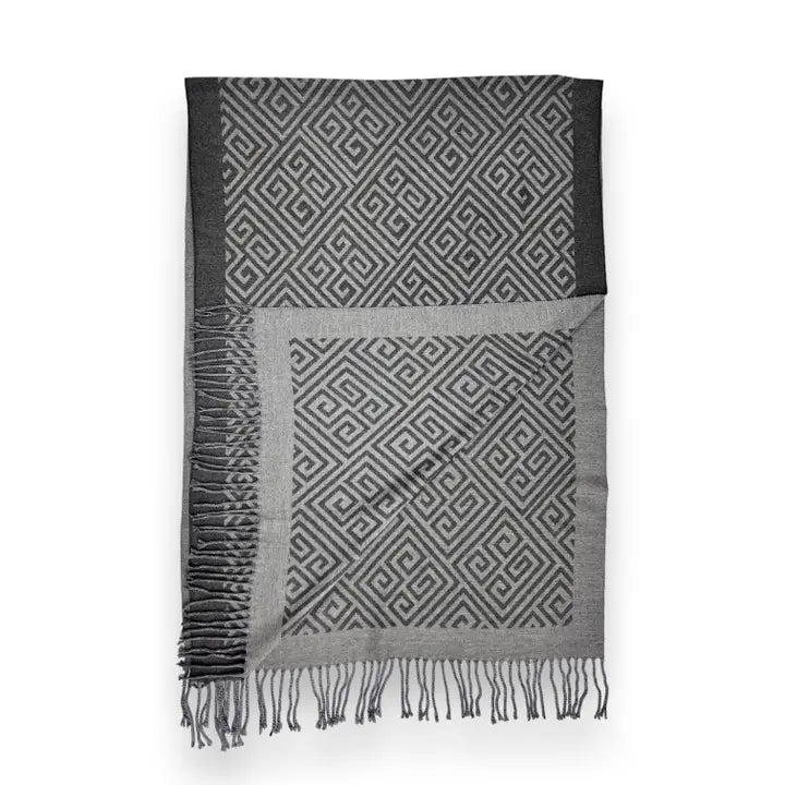 Maze print on a cashmere blend scarf. Scarf is finished with tassels on each end.