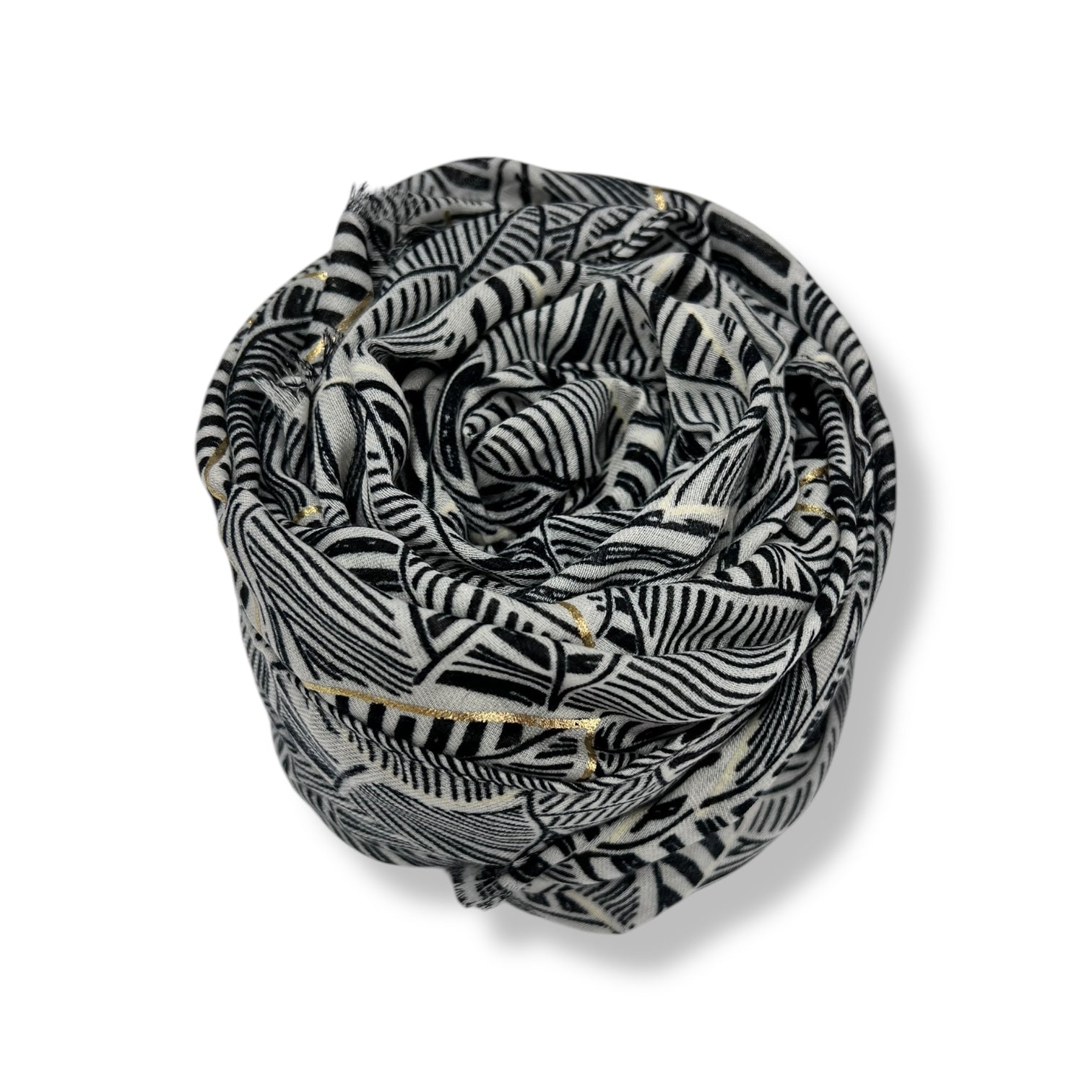 This scarf showcases an elegant monochrome leaf-inspired design with intricate patterns of overlapping leaves. Its lightweight and soft fabric make it a sophisticated accessory, perfect for complementing both casual and formal outfits. A timeless print that suits all seasons and styles.
