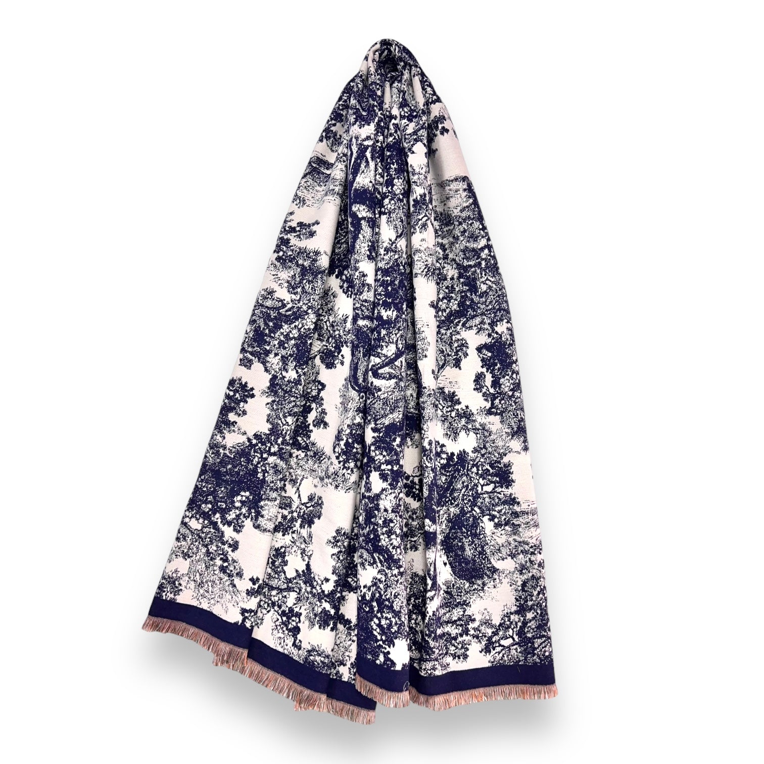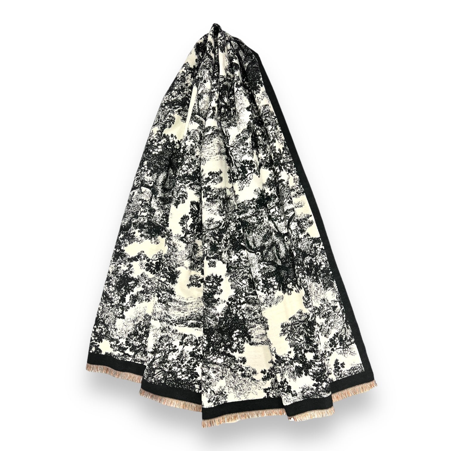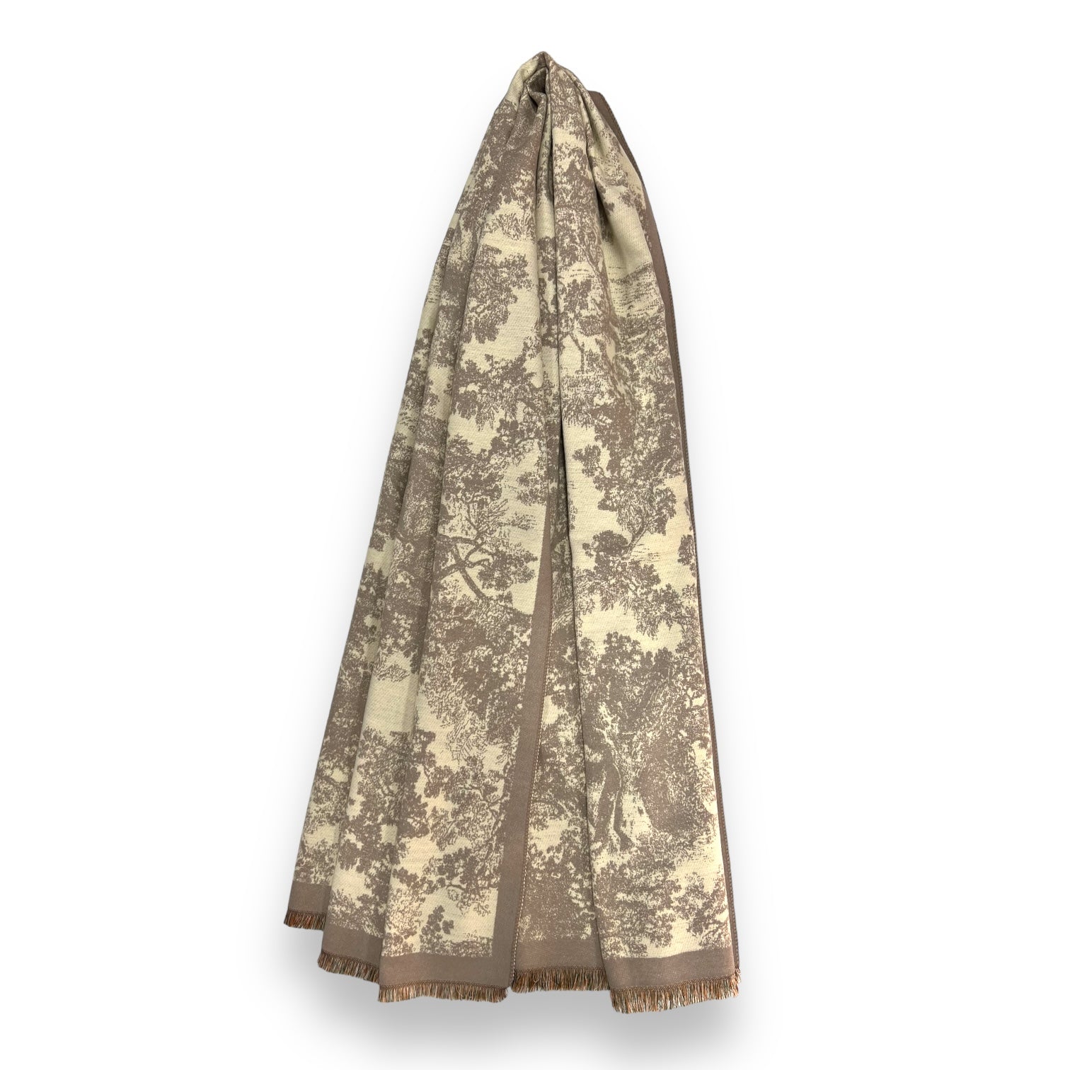 Soft to touch winter forest print on cream canvas. Finished with subtle fringes on each end.