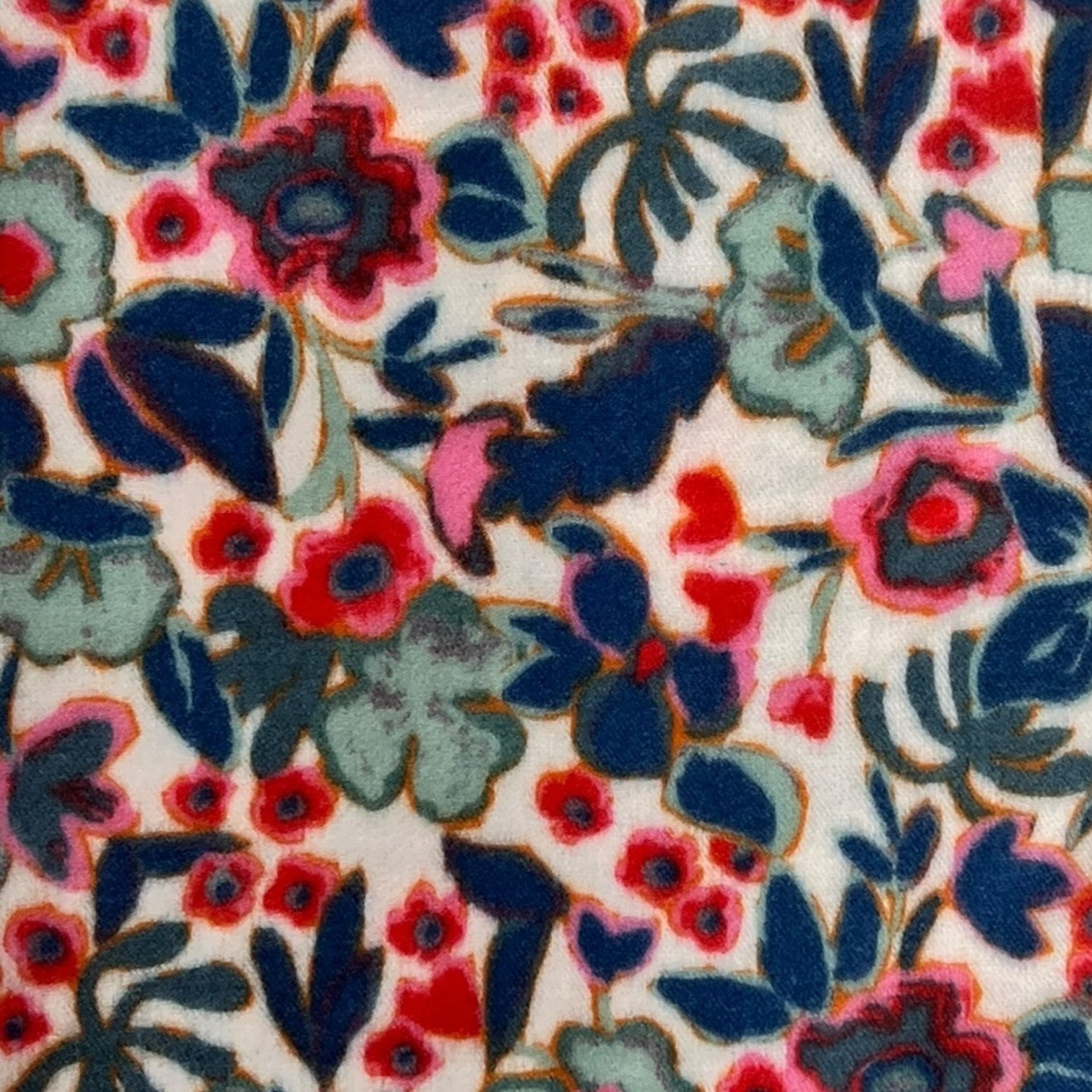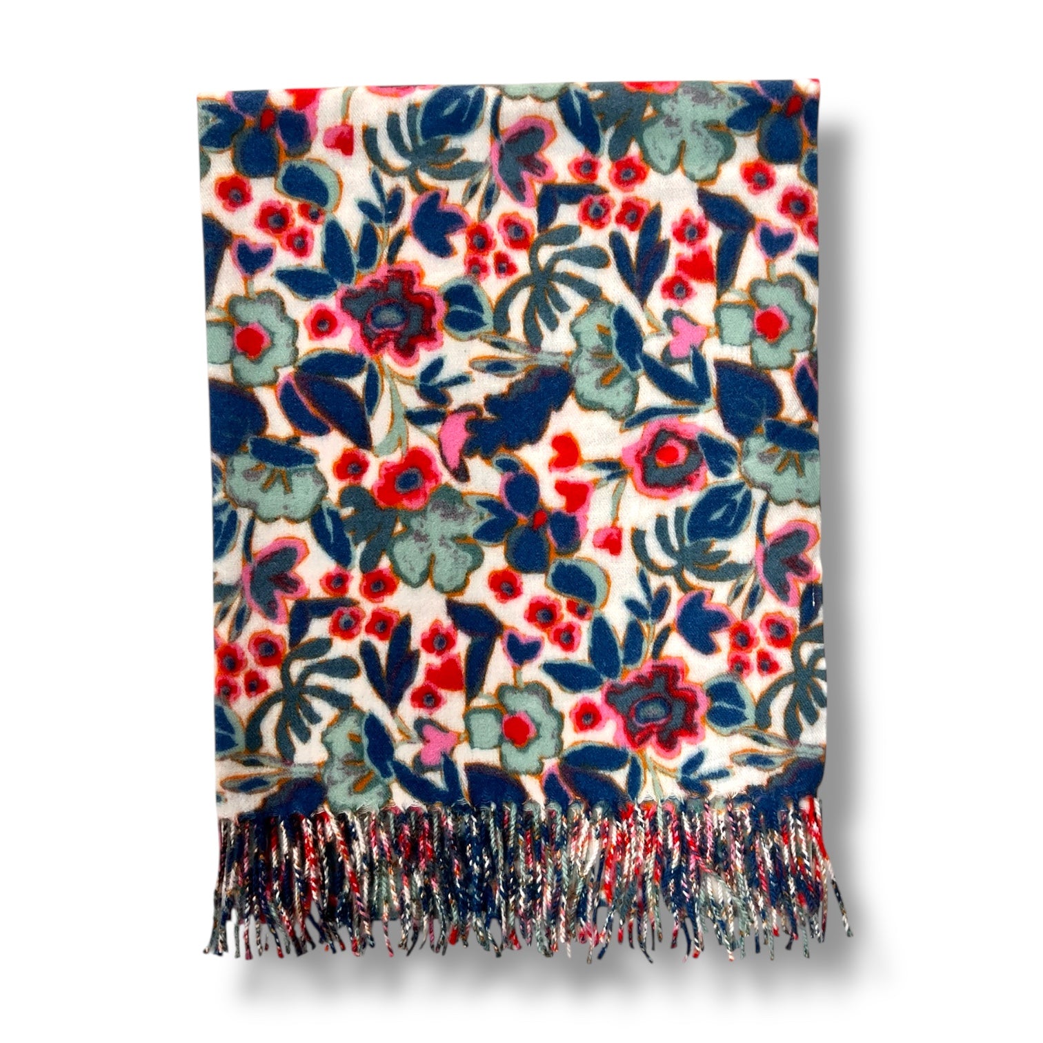 This beautifully detailed scarf features a rich floral pattern in vibrant shades of red, navy, and green on a soft cream background. The design is brought to life with a touch of warmth and texture, finished with elegant twisted tassel edges for a classic winter look.